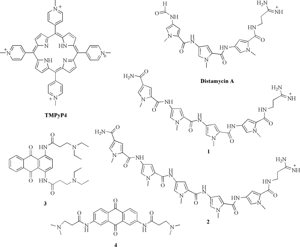 - Cocco, MJ; Hanakahi, LA; Huber, MD; Maizels, N. Specific interactions of distamycin with G-quadruplex DNA. Nucleic Acids Res 2003, 31, 2944–2951. [Google Scholar]