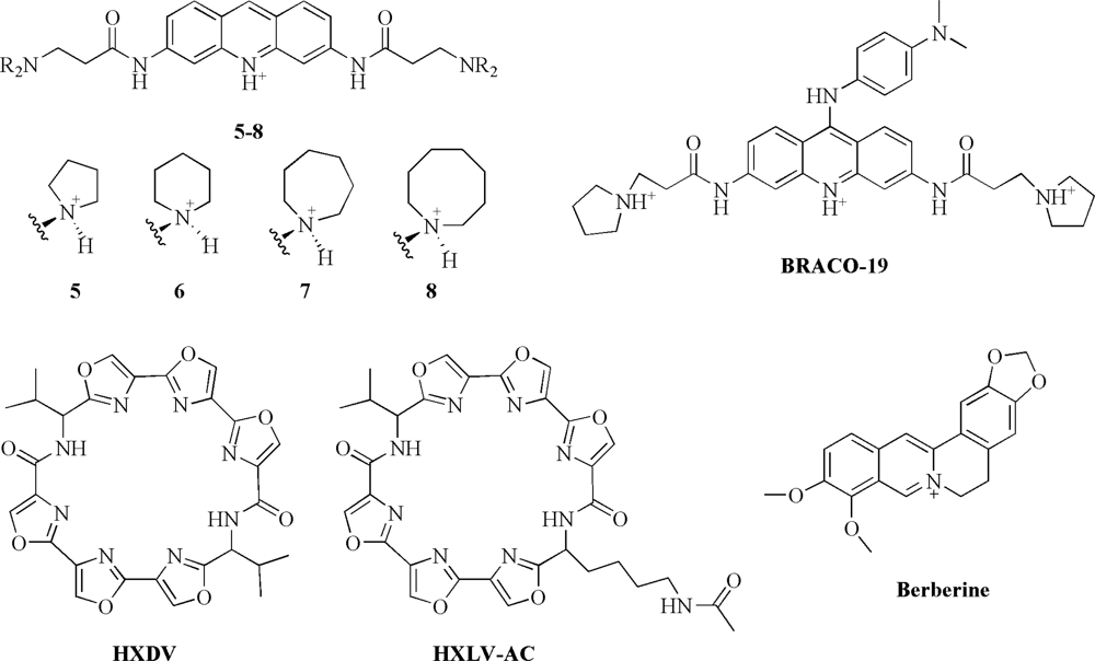 Another promising class of anticancer agents that target G-quadruplex DNA are the oxazole-containing macrocycles, which include the natural product telomestatin. Telomestatin (a heptaoxazole-containing macrocycle) has shown apoptotic activity in cancer cells and, very interestingly, it exhibits a high degree of selectivity for G-quadruplex relative to duplex DNA [57]. To develop new oxazole-containing ligands, Pilch et al. have characterized the binding of two synthetic hexaoxazole-containing macrocyclic compounds (HXDV and HXLV-AC, Figure 3) to the intramolecular G-quadruplex structural motif formed by human telomeric DNA in the presence of K+ ions [58]. Aside from six oxazole moieties, one of these compounds (HXDV) also contains two valine residues, while the other (HXLV-AC) contains one valine residue and one lysine residue in which the 4-aminobutyl side chain has been N-acetylated. Interestingly, both compounds exhibit cytotoxic activities versus human lymphoblast and oral carcinoma cells, with associated IC50 values ranging from 0.4 to 0.9 mM.