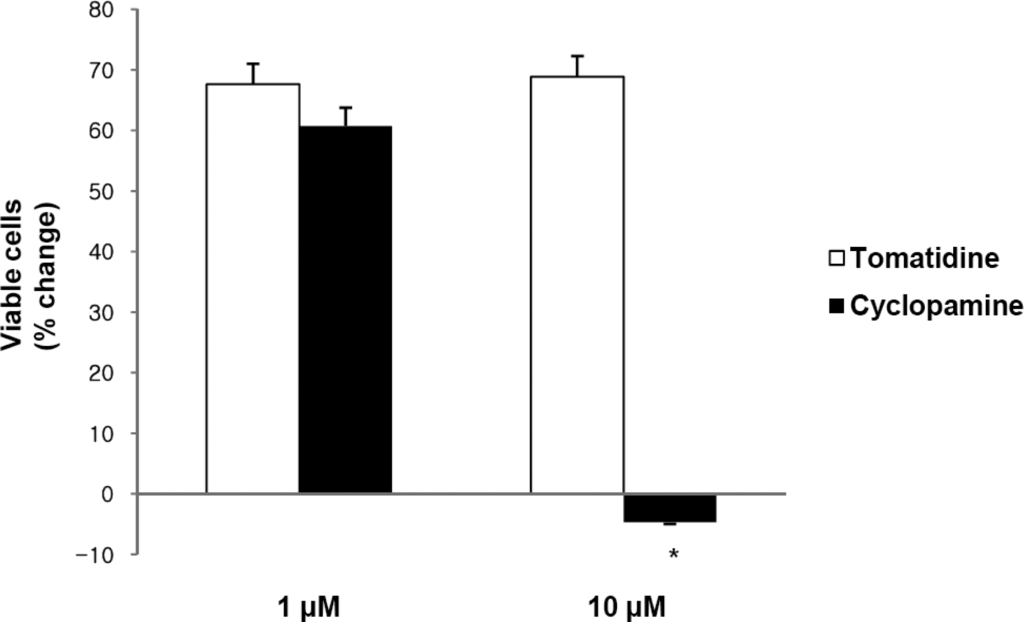 Effects of cyclopamine on proliferation of human gastric cancer cells (SNU16 cells). Proliferation was measured by WST-1. Cells were treated with tomatidine and cyclopamine at the indicated doses for 48 hrs. Data are expressed as percent change (means±SEM) compared to controls. *P<0.001, vs. tomatidine (Student’s two-tailed t-test).