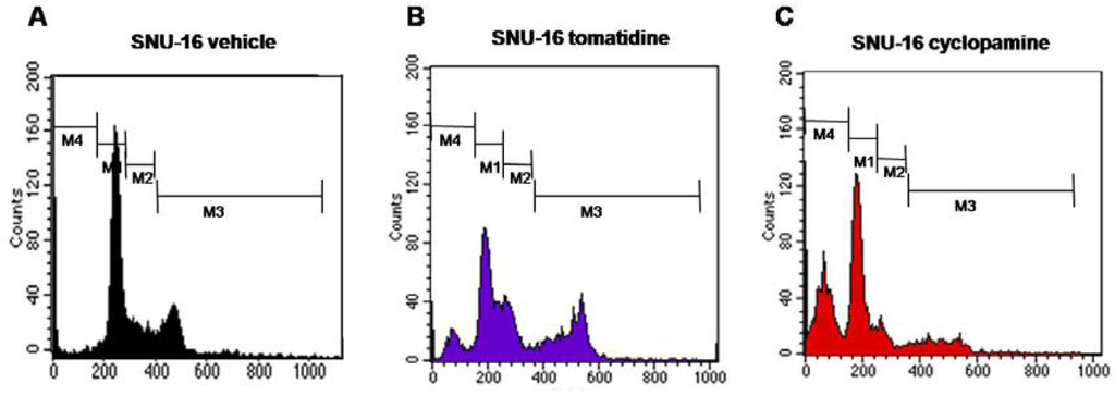 To reveal the mechanism underlying inhibition of proliferation by cyclopamine, we analyzed cell cycle. SNU16 cells (2 × 106) were incubated with vehicle, tomatidine or cyclopamine for 48 hrs at 37°C (Figures 2A, B, and C). Cell cycle (G0/G1, S, G2/M phases) was determined by flow cytometry. As shown in Figure 2, cyclopamine almost arrested the cell cycle of SNU16 cells. Cyclopamine decreased the populations of cells in the S and G2-M phases while hardly affecting those in the G0–G1 phase (Figure 2D). Simultaneously, quantification of apoptotic cells after cyclopamine treatment showed that cyclopamine significantly induced apoptosis of gastric cancer cells (Figure 2D).