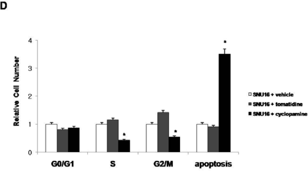Effects of cyclopamine on cell cycle distribution in SNU16 cells. Flow cytometry was used for analysis of cell cycle in SNU16 cells. Cells were treated with vehicle (A), tomatidine (B) or cyclopamine (C) for 48 hrs before analysis. (D) Quantitation of cell cycle distribution measured in (A), (B) and (C). To compare, the number of cells in vehicle-treated samples was adjusted to 1. The x-axis shows DNA content and the y-axis shows the number of cells. White bar, vehicle; Gray bar, tomatidine; Black bar, cyclopamine. Data are expressed as fold change (means±SEM) and represent four independent experiments. One-way ANOVA revealed significant difference. *P <0.01, vs. tomatidine.