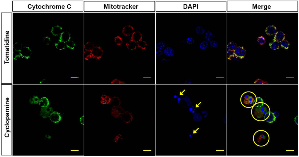 To further confirm cyclopamine-induced apoptosis, we stained nuclei with DAPI. We clearly observed fragmented nuclei in the cyclopamine-treated group but not in the tomatidine-treated group (Figure 3). Next, we tested the involvement of mitochondria in cyclopamine-induced apoptosis. We double-stained cells for mitotracker and cytochrome c to reveal the involvement of mitochondria. Confocal microscopy images in Figure 3 show the localization of mitotracker and cytochrome c. Cytochrome c staining was punctuated in tomatidine-treated cells. In cyclopamine-treated cells, cytochrome c release was indicated by diffuse staining.