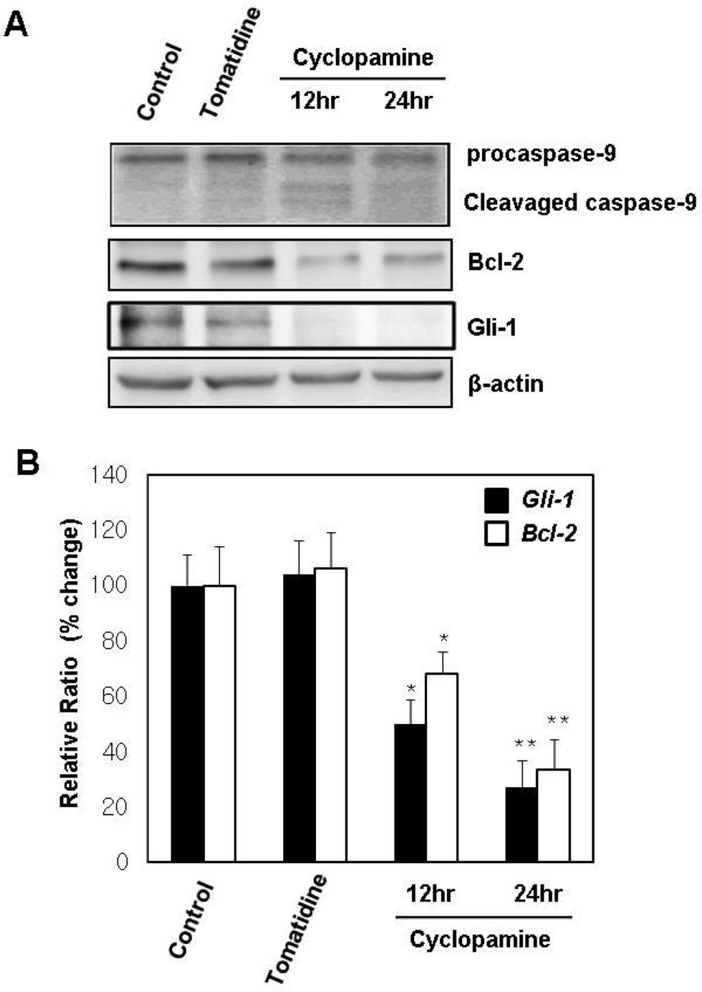We confirmed the involvement of mitochondria in cyclopamine-induced apoptosis by observing cleavage of caspase 9 (Figure 4A). Bcl family proteins have been shown to regulate the opening of mitochondrial permeability transition pores or the activity of Apaf-1. So we checked the protein level of Bcl-2 by Western blotting. We observed that the protein level of Bcl-2 was decreased in cyclopamine-treated cells, but not in tomatidine-treated cells (Figure 4A). Moreover, we also examined the mRNA level of Bcl-2 using real-time RT-PCR. The treatment with cyclopamine reduced the expression of Bcl-2 at the mRNA level (Figure 4B). The level of Gli-1, which indicates the activity of Hh signaling, was well correlated with the changes in that of Bcl-2 (Figure 4).