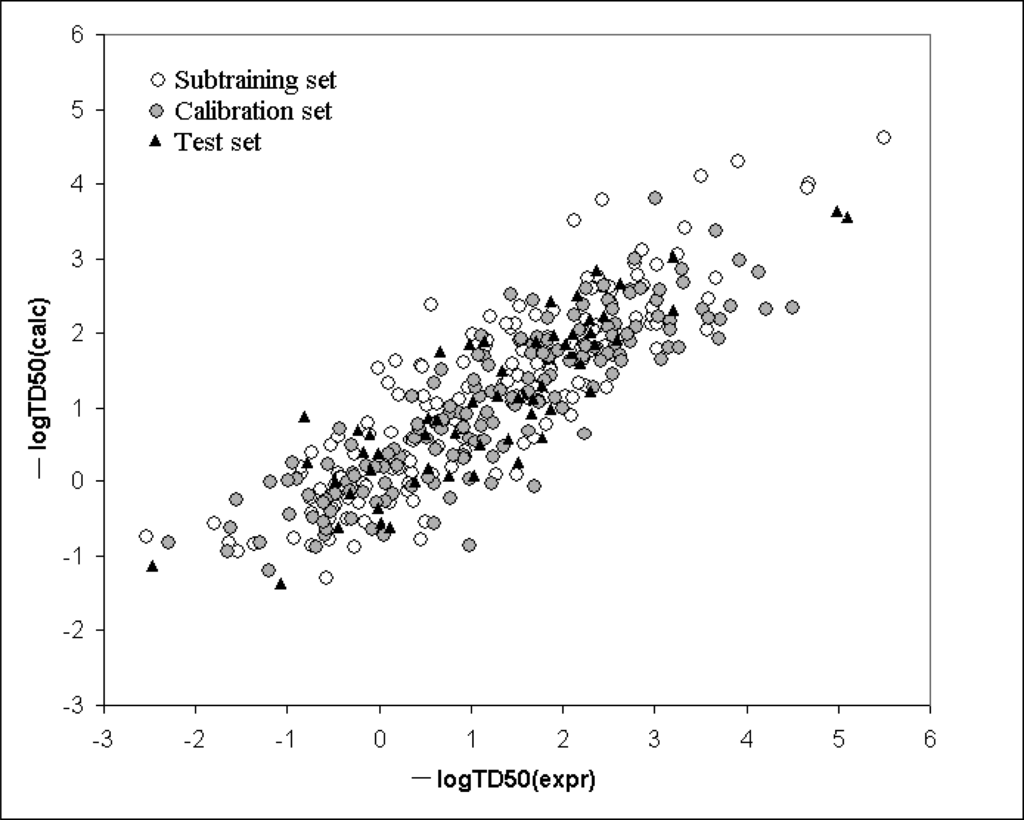 - - Blocking of rare SMILES attributes can improve statistical quality of the predicting. Splits into subtraining, calibration and test sets, as well splits into the training and test sets have influence to statistical characteristics of the models. In our case, in three splits examined in this study these characteristics are similar.