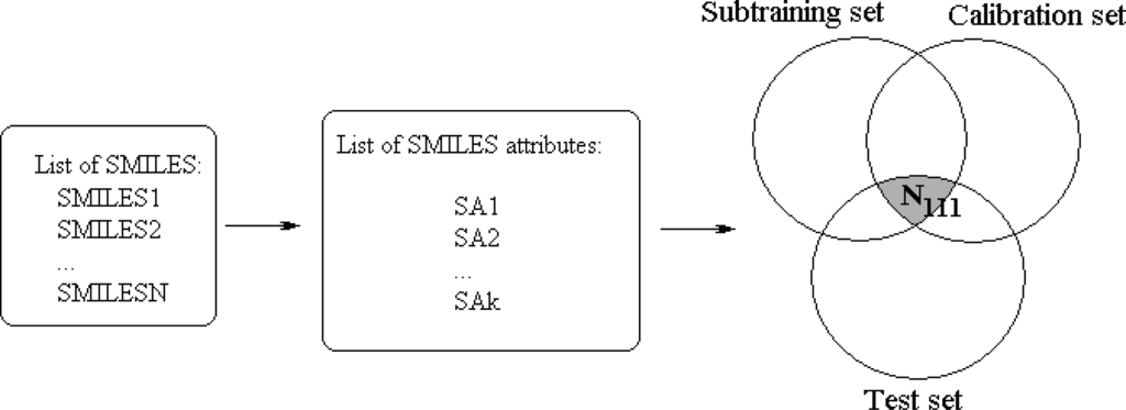 This system can be denoted as a [Subtraining-Calibration-Test] system. The model can be satisfactory if the N111, i.e., the number of active (not blocked) attributes which are present in subtraining, calibration, and test sets, is as large as possible. The more traditional, “classic” approach is the construction of the model using united training set to predict the endpoint for an external test set. This system can be denoted as [Training-Test] system. This model can be satisfactory if the N101, i.e., the number of active attributes which are present in both the training and test set is as large as possible.