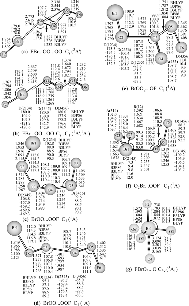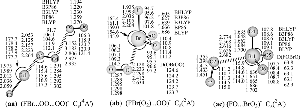 The FBr…OO…OO structures in 3A′ state (a: 3A′) optimized by three hybrid DFT methods (BHLYP, B3P86 and B3LYP) and in 1A′ (b: 1A′) (BHLYP) or 1A (b: 1A) state (with the rest four DFT methods) are reported in Figure 1. The optimized geometries for both Br- and F-terminal structures, including cis- and trans- BrOO…OOF (c: 1A and d: 1A), and BrOO(O)…OF (e: 1A), and those of Br-hypervalent structures, O2Br…OOF (f: 1A) and FBrO3...O (g: C3v, 3A1) are also displayed in Figure 1. The optimized geometries for anionic BrO4F− species, including (FBr…OO)−…OO (aa: 4A′) chain, and [FBr(O2)...OO]− (ab: 2A′), (FO…BrO3)− (ac: 2A′) Br-hypervalent structures are shown in Figure 2. They may represent an important intermediate in atmospheric reactions.