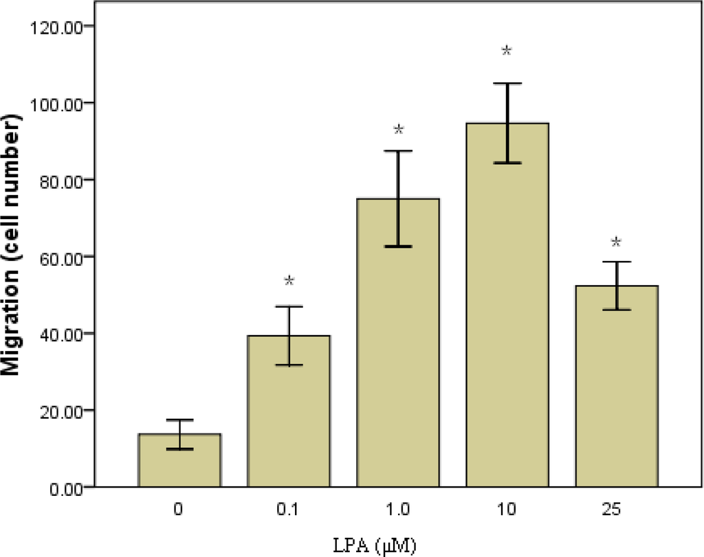 In order to confirm that LPA was able to induced RASMCs migration in our model, we performed a cellular migration assay. RASMCs (1x105 cells) were added to the upper wells of the Boyden chamber containing LPA (0–25 μM) in the lower chamber. Cells were incubated for 6 h to allow to migration. Results show that cells were induced by LPA to migrate to the lower well in a dose-dependent manner. The greatest number of migrating cells occurred at 10 μM LPA. The number of migrating cells decreased at higher LPA concentrations (Figure 1).