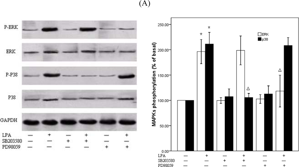 LPA induced phosphorylation of p38 MAPK and ERK.(Left panel) RASMCs were stimulated with the indicated concentrations of LPA for 10min. Total cell lysate was resolved by SDS-PAGE and immunoblotted with the indicated antibodies. (Right panel) Densitometric quantification of MAPK phoshorylation. P38MAPK or ERK activation was determined as an increase in the ratio of phospho-MAPK/total MAPK. Values are means ±S.E.M n =3. *P<0.01 vs. control (0μM LPA), ΔP<0.01 vs. each other group.