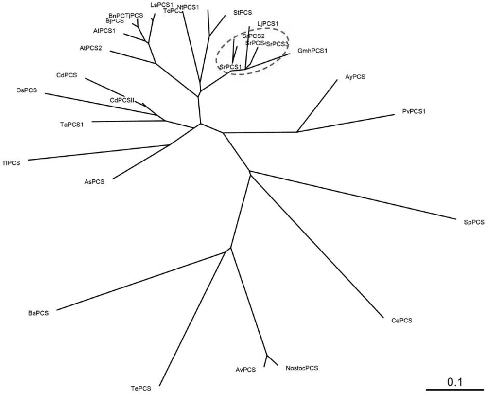 Among the four SrPCS cDNAs, the ORF of SrPCS3 is the longest one; its amino acid sequence shares 65% identity to Arabidopsis AtPCS1 [16], 87% identity to soybean GmhPCS1 [7] and 87% identity to L. japonicus LjPCS1 [18]. The identity of SrPCS3 with SrPCS1, SrPCS2 and SrPCS4 is 97.9%, 87.6% and 88.1%, respectively. The N-terminal domains of SrPCS3 and SrPC1, but not SrPCS2 and SrPCS4, contain a catalytic triad of Cys-56, His-162 and Asp-180 (Figure 1), which is essential for the activity [9,10,13,14].