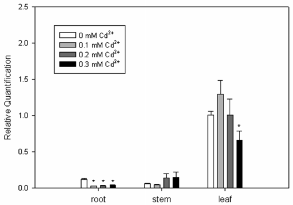 Expression analysis of SrPCS3 transcript by real-time PCR.The relative expression of SrPCS3 to an internal control glyceraldehyde-3-phosphate dehydrogenase (GAPDH) in S. rostrata plants, treated with different concentration of Cd2+ for 24 hours, was analyzed by real-time RT-PCR. Mean values plus standard errors are given. * indicates significance at the 5% level.