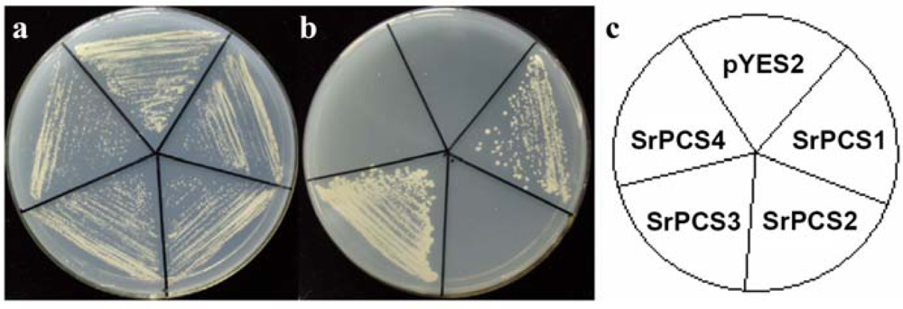 Cd tolerance assay of yeast cells expressing SrPCS cDNAs.Growth of control S. cerevisiae cells (carrying the empty pYES2 plasmid) and cells expressing one of the SrPCS1–SrPCS4 on YNB plate without (a) and with 600 μM Cd2+ (b). (c) a diagram showing the cells on plates shown in (a) and (b).