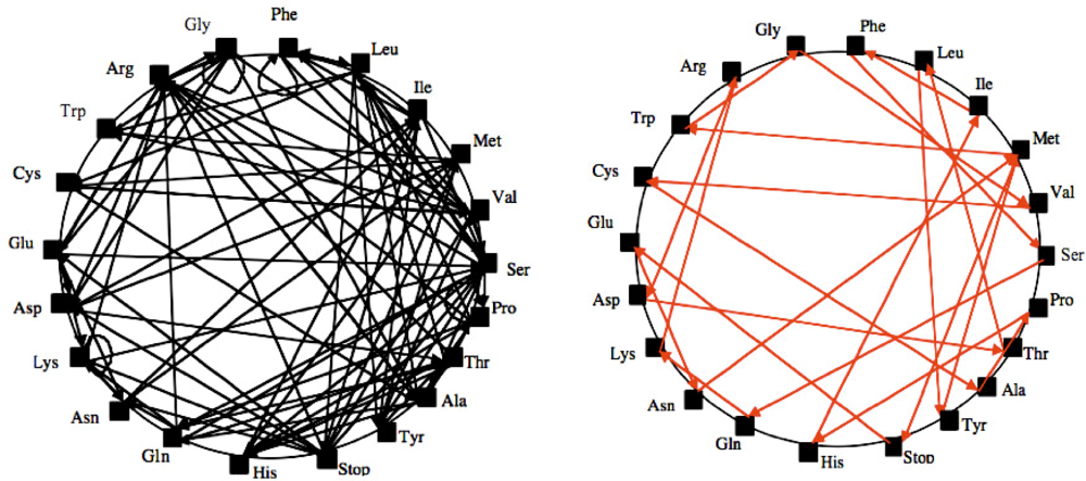 - He, M; Petoukhov, S; Ricci, P. Genetic code, hamming distance and stochastic matrices. Bull. Math. Biol 2004, 66, 1405–1421. [Google Scholar]