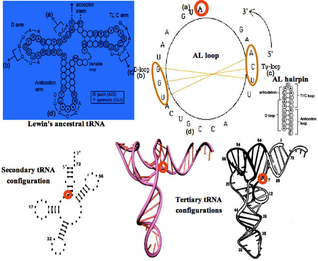 Secondary structure of the Lewin’s template tRNA with 4 parts (a,b,c,d) corresponding to the Gly-tRNA of Arabidopsis thaliana (top left); AL loop and hairpin (top right) with the pivot A and two complementary triplets (top right) causing the tRNA tertiary structure from secondary one (bottom).