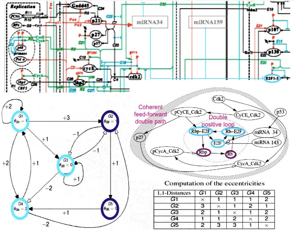 Schematic view of the cell cycle regulatory network (top, after [28]); zoom on the subnetwork centred on E2F (middle right); complexification of the subnetwork (middle left); computation of its eccentricities (bottom right). These representations highlight how miRs control globally the cell cycle by the manner they are connected to its regulatory network. Note the high eccentricity of miRNAs, revealing their upstream location in the regulatory system.