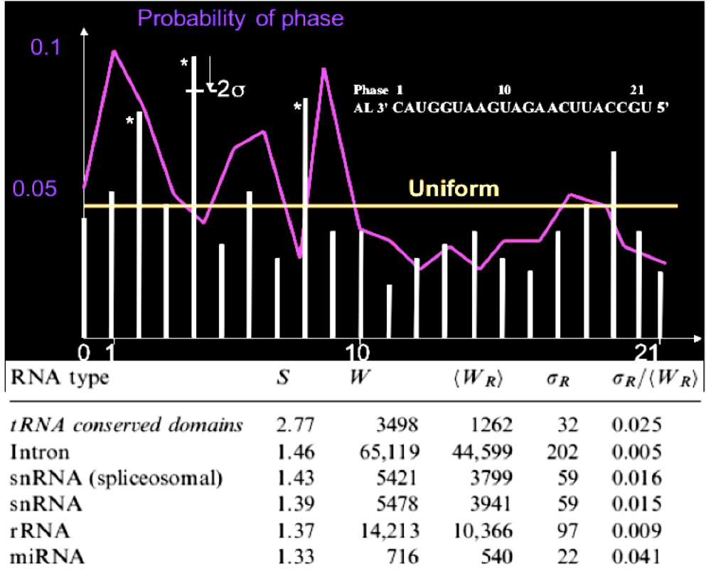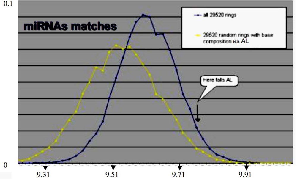 When we calculate the matching phase between the human miRs and AL, then we observe significantly (p=0.001) three phases corresponding to the best matches, i.e., the first base after the critical triplet GGU, the middle base of GGU and the base between the articulation A and GGU (Figure 5, top). This match is roughly respected by looking at the whole set of 29,520 variational solutions. The comparison between small RNAs and tRNA loops on one side, and AL on the other side done by counting their common substrings of length ≥ 5 (p=0.05), shows very significant similarities between RNA relics and this archetypal ring (Figure 5, bottom).