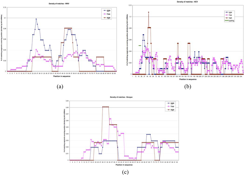 The number of perfect matches between miRs 34 and 143 and the eight selected viruses is important and rare: a match value more than 10 has a probability equal to 0.01 and would occur only 0.1 ± 0.2 times for miR-143 and the eight viruses and not three times as in Table 1, which is a rare event having a probability of “large deviation” type to occur (<10−6). The best matches between human miRs and three viruses, West Nile (WNV), hepacivirus (HCV) and dengue, are given in Figure 7, showing that the percentage of segments of miRs matching the UTR parts of these virus fluctuates along the viral RNA, and that the integral of the matching curve is less important for a bird (Gallus gallus, gga) than for the human host and for the vector (hsa) in the case of non avian viruses (dengue and hepacivirus) and is more important for the vector Aedes or Anopheles (aga) involved in dengue and West Nile virus, but not in hepacivirus transmission [35].