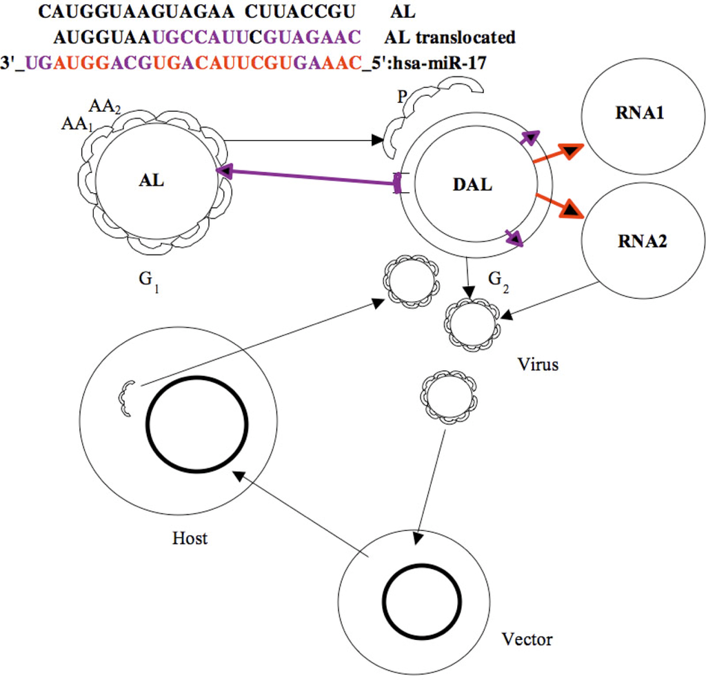 Evolutionary operators: Mutation/translocation/inversion/insertion (violet) and replication (red) on miR 17 (top); bi-directional exchange between AL RNA and its DNA version DAL as peptides P and RNA building machinery, and present host/vector/virus co-evolution process (bottom).