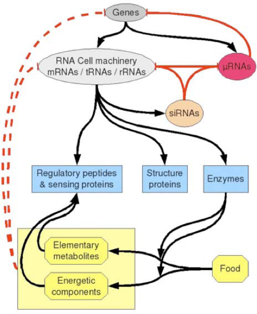 Schematic view of regulatory processes that can occur in a cell. Positive and negative classical regulations as well as syntheses are shown as black arrows. Negative regulations due to miRs and siRNAs are indicated as red arrows. A possible contextual down-regulation (dashed red lines) could come from direct interaction between metabolites (amino-acids and their derivatives, or energetic nucleotides) and RNA or DNA sequences.