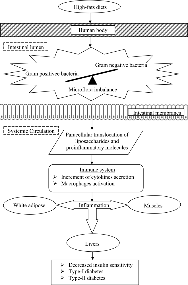 Past studies have also postulated that the onset of diabetes is associated with a poor inflammatory status of the individuals that have consumed high-fats diets over prolonged periods (Figure 2). Cani et al. [33] evaluated the effects of a high-fat diet on lipopolysaccharides using mice as a model. The authors demonstrated that the composition of natural intestinal gut microflora often determine the degree of inflammation contributing to the onset of diabetes and obesity. The concentration of plasma lipopolysaccharides, the proinflammatory factor, is inversely correlated with the population of Bifidobacterium spp. It has also been reported that in high-fat diet-induced diabetes, the concentration of Bifidobacterium spp. in the gut was positively correlated with improved glucose tolerance and glucose-induced insulin-secretion as well as decreased diabetes endotoxemia, plasma and adipose tissue inflammatory cytokines [33]. Several studies have also shown that bifidobacteria can reduce the intestinal endotoxin levels and improve mucosal barrier thus reducing systemic inflammation and subsequently reduced the incidence of diabetes [34].