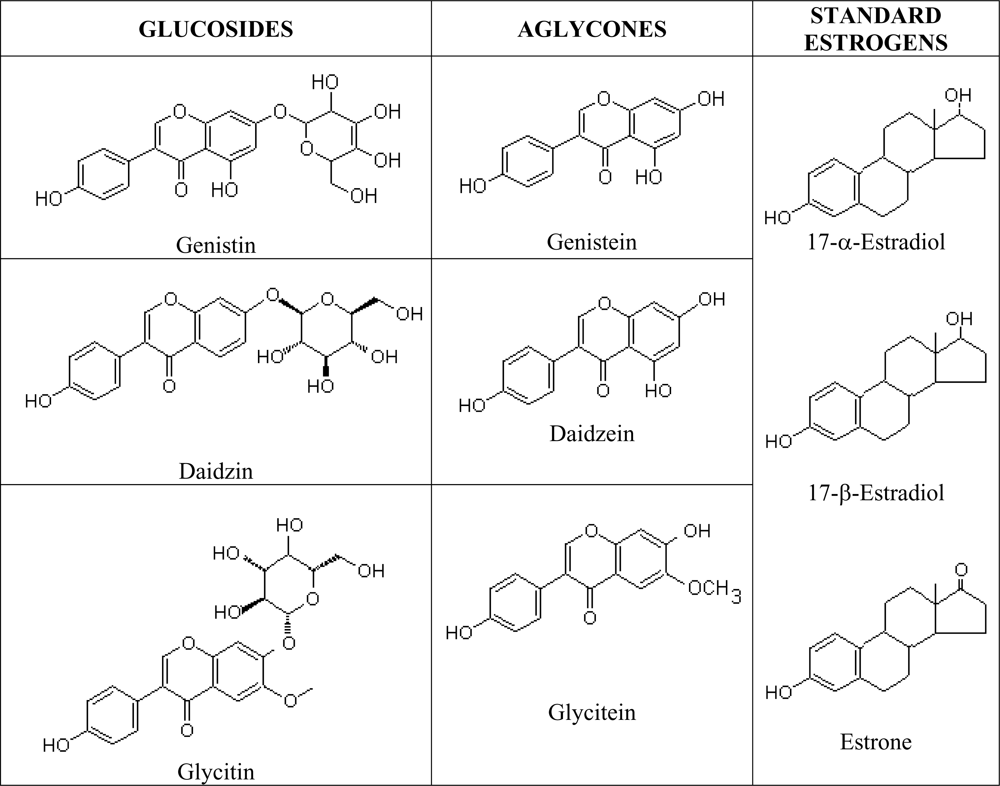 Gut microflora or probiotics readily hydrolyze the main isoflavonoid glucosides in legumes, such as soy, including genistein and daidzein, into bioactive aglycones [66]. Isoflavone aglycones are absorbed faster and in greater amounts, because aglycones have greater hydrophobicity and a smaller molecular weight compared to the native glucosides [68]. Isoflavones in soy protein are ingested in modest amounts, absorbed following biotransformation by intestinal microflora, and undergo enterohepatic recycling, reaching circulating concentrations that exceed by several orders of magnitude the amounts of endogenous estrogens [64], despite having weaker binding affinity for estrogen receptors [70]. Hence, although isoflavone genistein has a relatively low potency, of one third that of estradiol, high concentrations in plasma may be sufficient to cause a variety of physiological effects [66]. Studies have recorded increases in total circulating estradiol concentrations following soy isoflavone consumption [70]. The 30–50 mg/day threshold intake of dietary estrogens necessary to achieve a biological effect in humans is readily attainable by the inclusion of modest amounts of soy protein [64]. Kano et al. [68] showed that isoflavone aglycones were absorbed faster and in greater amounts than when ingested in the form of a beverage like soymilk. Naturally, the high intake of soy and soymilk in Japanese diet has been benefiting the Japanese, as the plasma of Japanese men reportedly contains as much as 7- to 110-fold the concentration of in phytoestrogens a similarly aged group of Finnish men [71].