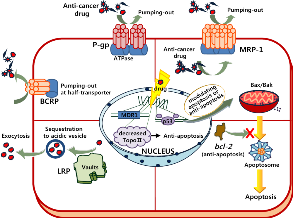 Drug resistance in tumors can occur due to both impaired drug delivery to the cancer tissue and the defense mechanisms of the cancer cell itself []. In general, broad-based drug resistance, either intrinsic or acquired, exists in tumors and is believed to be caused multifactorially (Figure 1). This has significantly hindered clinical efforts to formulate effective chemotherapy strategies against several blood cancers, as well as solid cancers associated with breast, ovarian and lower gastrointestinal tract cancers [–]. Until recently, various tissue culture studies have consistently shown that MDR in most cultured cancer cells involves ATP-binding cassette (ABC) transporters in the human such as P-glycoprotein (P-gp, ABCB1) [–], multidrug resistance protein (MRP, MRP-1/ABCC1) [–], breast cancer resistant protein (BCRP, ABCG2) [], lung resistant protein (LRP) [–], bcl-2 [], p53 [,], Topoisomerase II (TopoII) [,], etc.