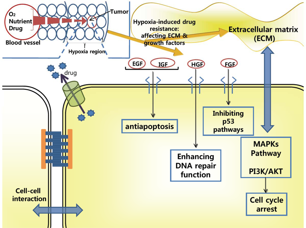 Most importantly, the role of the microenvironment in the drug-resistance of tumors is multi-factorial [–]. Growth factors modulate the drug-resistance of cancer cells and usually activate changes in adhesion molecules [–]. The adhesion molecules such as Cadherin promote the signaling of soluble factors, which induce the anti-apoptotic factors [–]. Tumor cells adherent to ECM components attenuate growth factor-mediated cancer cell protection [–]. Hypoxia increases anti-apoptotic proteins (e.g., bcl-2, bcl-XL, IAP family members), arrests cell cycle (due to increased CDK inhibitors p27/Kip1 and p21/Clip1), and elevates glutathione S-transferase-π level (associated with tumor progression and invasion). In addition, hypoxia through hypoxia-induced factor-1 (HIF-1) exhibits the expression of ATP-binding cassette drug effluxes (P-gp and BCRP). On the other hand, hypoxia modulates the tumor microenvironment by up-regulating vascular endothelial growth factor and its receptors, and facilitates aggressive proliferation of tumor cells with genetic instability [,].
