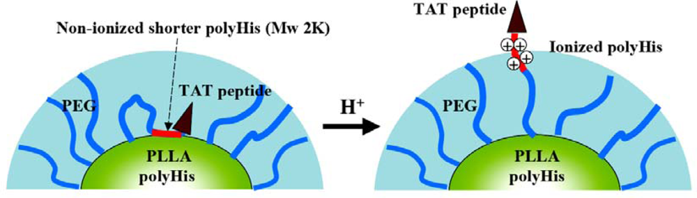 Schematic representation of the acid-induced pop-up targeting mechanism (PHSMpop-upTAT) of the peptide-conjugated micelle corona. See text for details. Reproduced with permission from reference [].