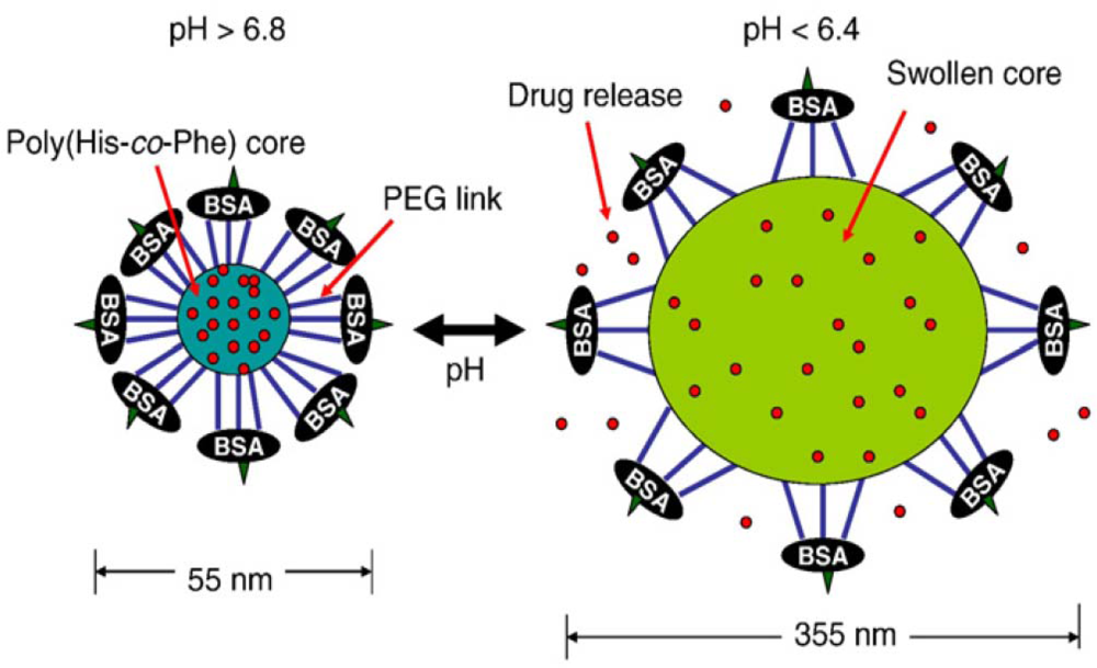 The virogel system is now one of the most promising nanoparticular delivery systems because this system has cell specific infection, injects a toxin, destroys MDR tumor cells, and migrates to neighboring MDR tumor cells with repeated cycles []. This system consists of a lipophilic core [poly(l-histidine-co-phenylalanine): poly(His-co-Phe)] and two hydrophilic shells [PEG and bovine serum albumin (BSA)]. One end of the PEG is linked to the core-forming block and the other is randomly linked to BSA, which forms a capsid-like shell (Figure 4) []; this structure is formed by an Oil-in-water emulsion method. It is worth noting that this system has a reversible swelling/deswelling property that is dependent on pH. The anticancer drug (doxorubicin) is released when the virogel is swelled at pH 6.4 (endosomal pH), but the rate of drug release is reduced when the virogel is in the deswelled state at pH 7.4–6.8 (cytoplasmic pH). Moreover, this system can physically disrupt the endosomal membrane due to the volumetric expansion (average particle size ~355 nm at pH 6.4) of the virogel at endosomal pH. Thus, upon endosomal uptake and acidification the virogels release the drug and disrupt the endosomal membrane. The virogels then shrink in the cytoplasm in response to the cytoplasmic pH, and wait lysis of the tumor cell due to the release of the anticancer drugs in the endosome. The virogels then are released from the lysed cell and can subsequently infect neighboring tumor cells. Although further in vivo investigations are required, this nanoparticular system is believed to be a highly promising candidate for treating wild and MDR tumors.