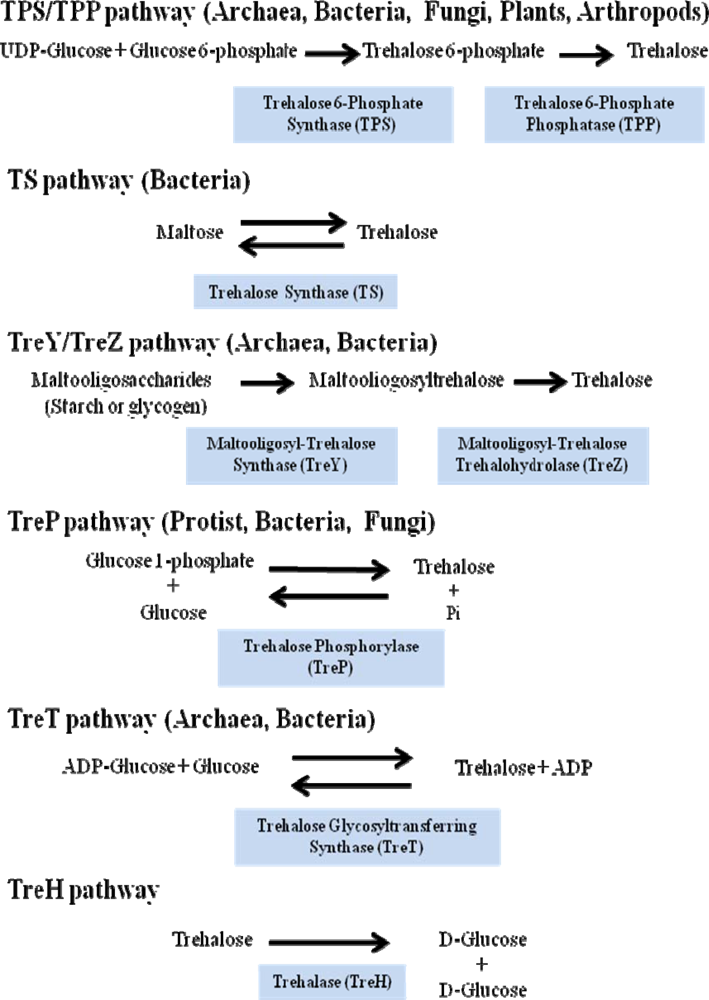 Other microorganisms, when exposed to extreme conditions become adapted and struggle against stress by means of biosynthesizing osmotically active compounds, for osmoprotection and thermoprotection. Among these compounds are the polyols such as mannitol and sorbitol, certain amino acids such as proline and glutamic acid; quaternary salts such as glycine betaine and disaccharides such as sucrose or trehalose []. There are five pathways for trehalose biosynthesis present in the three domains of the tree of life (Figure 2):