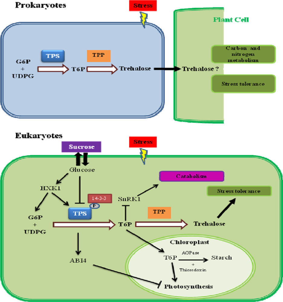 The role of trehalose pathway in prokaryotes and eukaryotes. Trehalose in prokaryotes dramatically accumulates in osmotic or thermal stress conditions; it can signal from the bacteria to the plant cell stress tolerance and nitrogen and carbon metabolism. In plants, trehalose 6-phosphate (T6P) plays a central role regulating sugar metabolism and plant development. Glucose and trehalose are also important keys to several signaling and regulatory pathways and integrate external cues to adapt cells to abiotic stress, growth and development. It seems that TPS1 and ABI4 are part of the HXK1 signaling pathway. Other molecular actors in this network are the 14-3-3 proteins, which are known to interact with phosphoserine in diverse proteins including TPS; and SnRK1, which signals catabolism in starvation conditions, and is countered by T6P to induce anabolism. Thus, an important role of the trehalose biosynthesis pathway in higher plants would be the synthesis of small amounts of T6P and/or trehalose signaling molecules rather than accumulation of this latter as an osmoprotective compound.