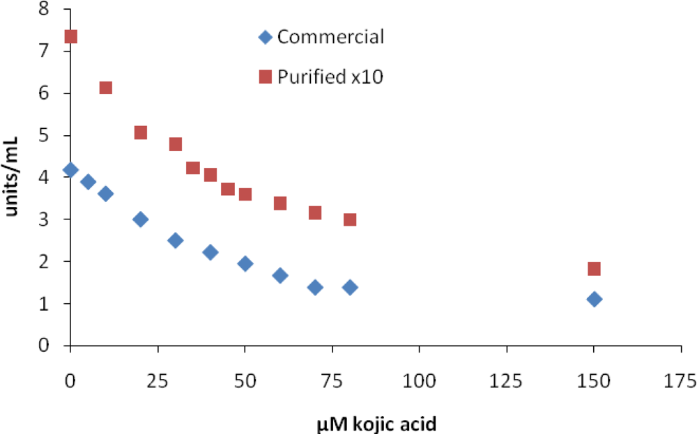 Inhibition of mushroom tyrosinase by kojic acid. Assays were carried out as described in the Experimental section.