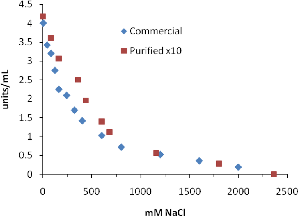 Figure 2 shows the plot of MT activity vs. NaCl concentration using the commercial and purified MT. These IC50 values for NaCl were much higher than that reported by Park et al. [], who suggested that Cl− was responsible for inhibition and not Na+. They also used DOPA as a substrate for tyrosinase. We have no reasonable explanation for the difference in our results vs. those by Park et al. [] except for the source of commercial tyrosinase used in the two studies. However, even our purified MT showed a much higher IC50 value than the commercial MT.