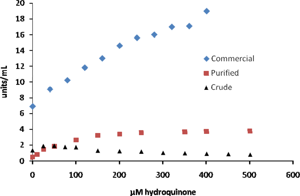 The third group of inhibitors (hydroquinone, lysozyme, ZnSO4, anisaldehyde) tested seemed to show little or no inhibition of tyrosinase or required concentrations to reach 50% inhibition that were much different than those reported by other investigators (Table 1). This was true for all of the different tyrosinase samples tested. For example, using DOPA as a substrate we found that hydroquinone increased reactions rates at lower concentrations of hydroquinone and caused inhibition at higher concentrations for some of the enzyme samples (Figure 4). Although hydroquinone has been reported to be an inhibitor of MT, Kasraee [] and Passi and Nazzaro-Porro [] have reported that hydroquinone can act as a substrate for MT in which the oxidation product of hydroquinone, parabenzoquinone, can oxidize DOPA. Enhancement in our observed rates at lower concentrations of hydroquinone could be a result of hydroquinone coupled oxidation of DOPA as well as enzyme catalyzed oxidation of DOPA. This apparent activation varied between 20–500 μM hydroquinone for the different MT samples (Figure 4). The crude tyrosinase showed a decrease in activity beyond 100 μM hydroquinone, while the commercial enzyme showed increased activity up to 400 μM hydroquinone. In contrast, the purified enzyme showed an increase in activity with increasing hydroquinone up to 200 μM and then activity seemed to remain relatively constant up to 500 μM hydroquinone.
