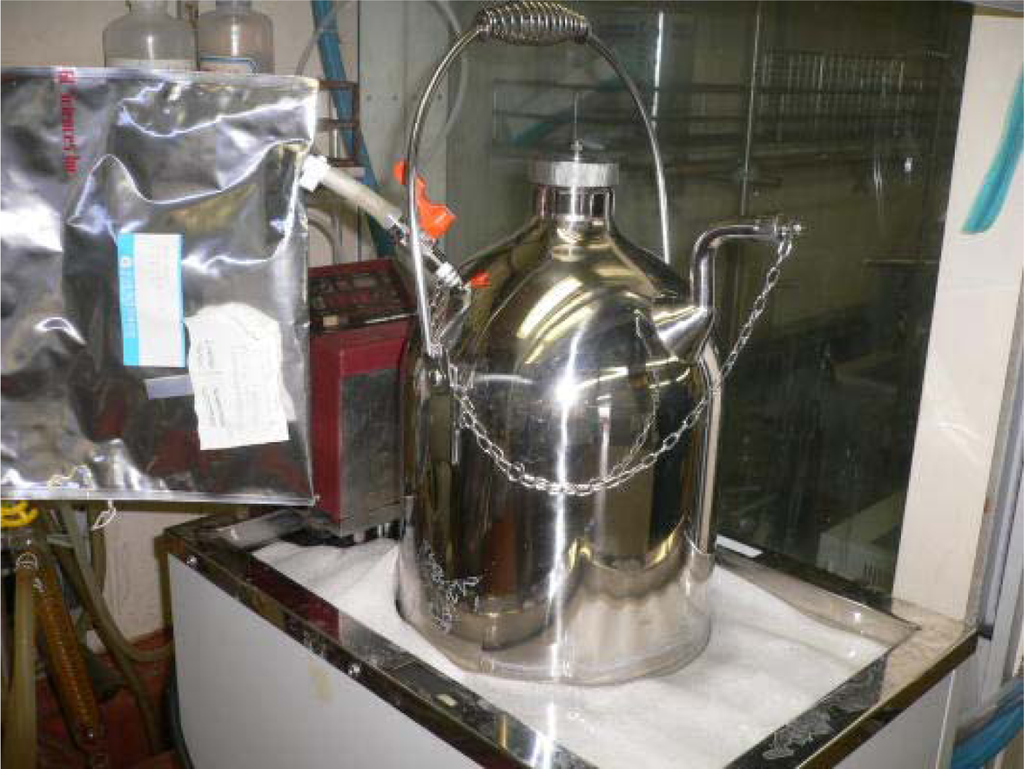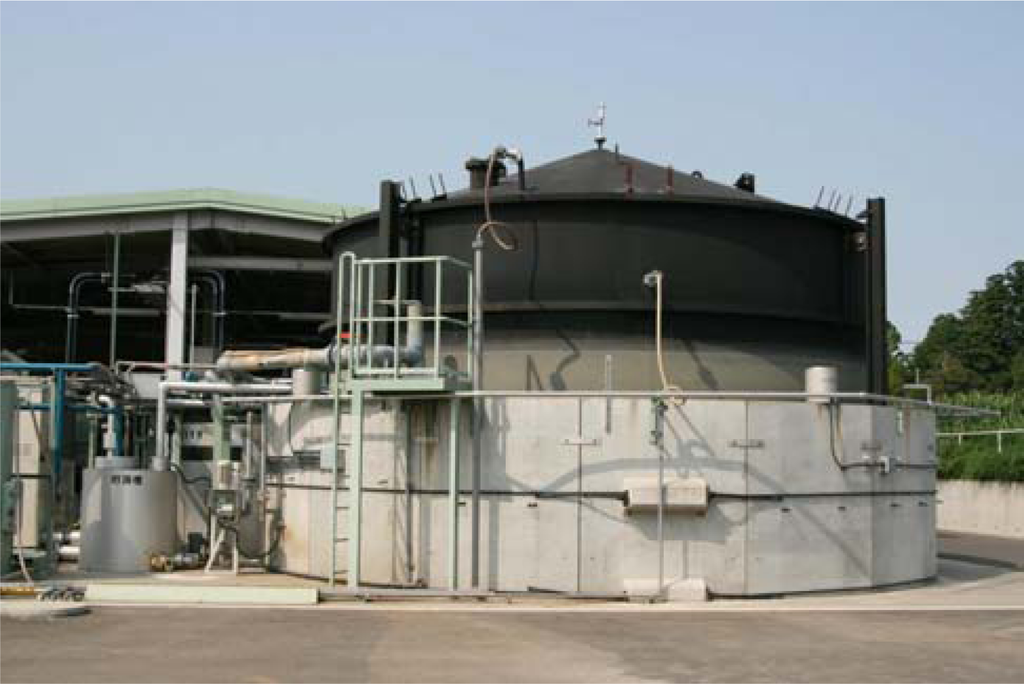 The Yamada Biomass Plant in Chiba Prefecture, Japan, operates an anaerobic fermentation tank (Figure 2) in which anaerobic fermentation mainly uses cow manure and vegetable waste as the feed stock at about 37 °C. The fermentation tank volume is 350 m3 and its retention time is 27 days. The sludge in this plant was used as the sludge for the anaerobic biodegradation test at 35 °C. There is no anaerobic fermentation plant operating at 55 °C around our laboratory, therefore, we made the sludge adapted at 55 °C. To make the sludge adapted at 55 °C, the sludge from the tank operating at around 37 °C in the Yamada Biomass Plant was preincubated at 55 °C [].
