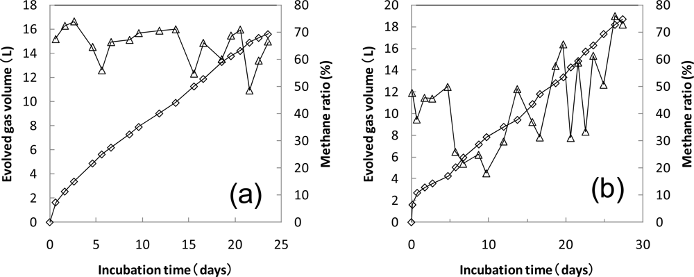 The biogas volume in the gas sampling bag was measured using a glass syringe (500 mL). The H2S concentration in the bag was measured using a disposable detector tube. CO2 and CH4 in the bag were analyzed by a gas chromatograph (Shimadzu GC-8APT) equipped with a SHINCARBON ST column (2 m × 3 mm Φ, Shinwa Chemical Industries, Ltd., Japan) and thermal conductivity detector (80 °C initial temperature, 200 °C final temperature, 20 °C/min rate). The peak area ratio of (CH4/(CO2 + CH4)) obtained by GC was converted to a volume ratio of (V(CH4)/(V(CO2) + V(CH4)) using the calibration curve obtained by an experiment using standard gas of CO2 and CH4. The methane ratio (%) was calculated as 100 × V(CH4)/(V(CO2) + V(CH4)).