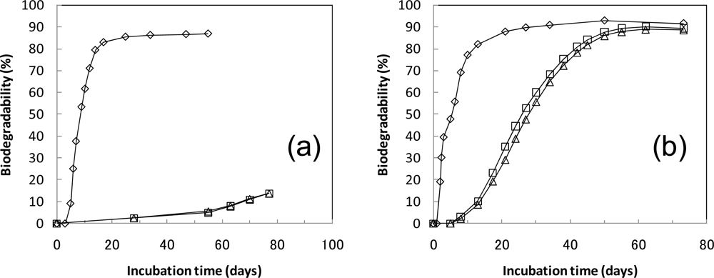 Provisional biodegradability in PLA anaerobic biodegradation test.The test vessels were incubated at 35 °C (a) and 55 °C (b). ⋄; cellulose 10g, Δ,□; PLA 10g. The biodegradabilities at each point were calculated as ((ΣV(s) – ΣV(b))/V(max)) × 100. The gas volumes from blank vessel were 0.03 (L) in 77 days (a) and 0.79 (L) in 73 days (b), measured at the end of the test. The gas volume from the blank vessel at each measuring point is calculated as ((incubation time)/77) × 0.03 (a), ((incubation time)/73) × 0.79 (b). The gas volume from the blank vessel at each measuring point is assumed to be the values when the volume from the blank vessel at the end of the test is proportionally divided by the incubation time.