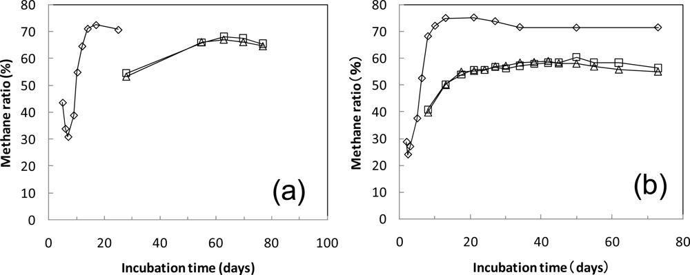Methane ratio in PLA anaerobic biodegradation test. The test vessels were incubated at 35 °C (a) and 55 °C (b). ⋄; cellulose 10g, Δ,□; PLA 10g.