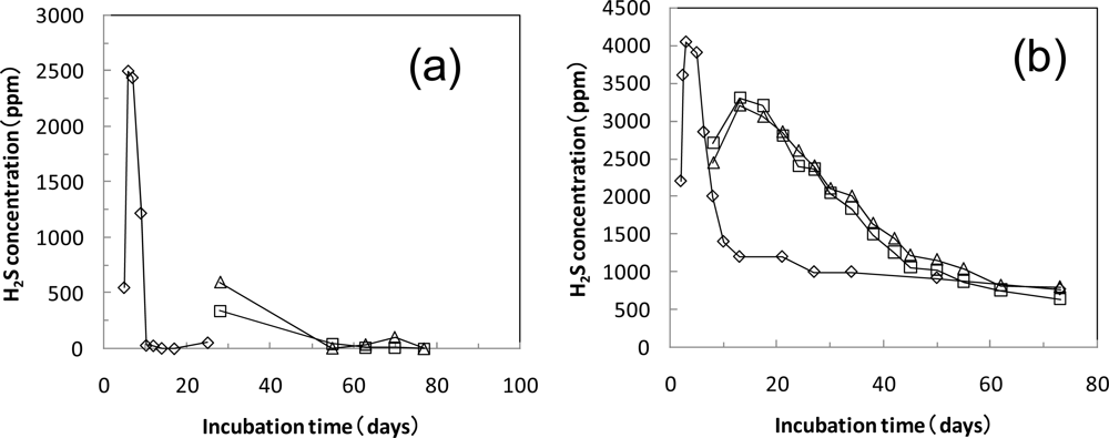 H2S concentration in PLA anaerobic biodegradation test. The test vessels were incubated at 35 °C (a) and 55 °C (b). ⋄; cellulose 10g, Δ,□; PLA 10g.
