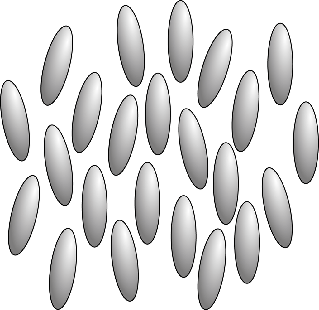 An isotropic liquid possesses full translational and orientational symmetry T(3) × O(3). At the transition in the nematic phase the translational symmetry T(3) remains the same, but the rotational symmetry O(3) is broken. In the simplest uniaxial nematic structure the group O(3) is replaced by one of the uniaxial symmetry groups D∞ or D∞ h. The nematic molecular order is shown schematically in Figure 1.