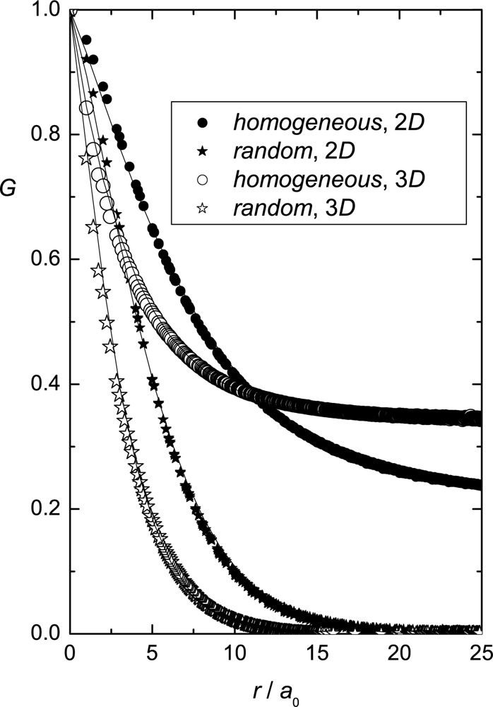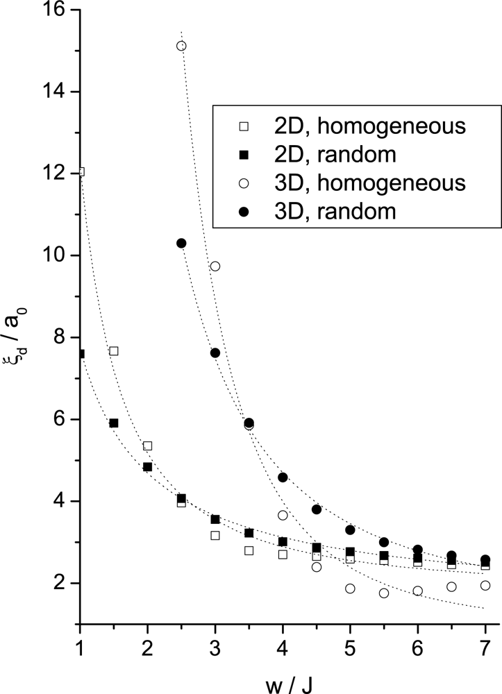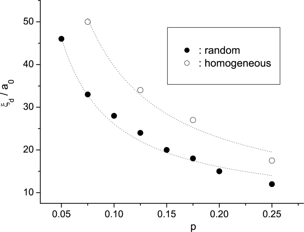 It was shown that the 1st order phase transitions become gradual as disorder exceeds the critical value [7]. With respect to the 2nd order phase transitions we refer to the Harris criterion [8]. It claims that the random bond disorder can change critical properties of a transition if α > 0. Here α stands for the critical coefficient describing thermal behavior of the specific heat. On the other hand, the renormalization study of the random anisotropy magnetic system [5] showed that the fixed point corresponding to the non-random critical behavior is unstable even with respect to infinitesimally weak disorder strength. This instability indicates either smoothing of the transition or a transformation into the 1st order transition. The latter effect could arise due to the static disorder affecting the Goldstone (also called gauge) type continuum field [9] in a reminiscent way as the thermal fluctuations of this field trigger the so called Halperin-Lubensky-Ma effect [10, 11] (i.e., they transform the 2nd order phase transition into the 1st order). Note that the static disorder is much more efficient in comparison with the thermal one because of its persistent influence. It was shown that the static random field fluctuations could behave like thermal fluctuations with the lower marginal dimensionality increased by two [12]. Regarding the structure of the disordered magnetic phase, some studies predict that the symmetry broken phase exhibits a domain type structure characterized [12] by a single characteristic length scale ξd. In that case the disordered phase exhibits a short range order (SRO). One of the cornerstone of statistical mechanics of disorder, the so called Imry-Ma theorem [12], claims that below the spatial dimension d = 4 the ordered state is unstable to an arbitrary weak random field that couples linearly with the order parameter. The latter exhibits continuous symmetry breaking transition on entering the lower symmetry phase. Furthermore, the scaling law ξd ∝ w2/(d–4) is predicted, where w measures the disorder strength. However, some studies using different approaches predict for random anisotropy models and a weak enough disorder strength the algebraic decay of correlations [13, 14], the hallmark of quasi long range order (QLRO). But latter studies reveal that even in this case a characteristic length is present marking the distance above which the correlations decay rather weakly [15].