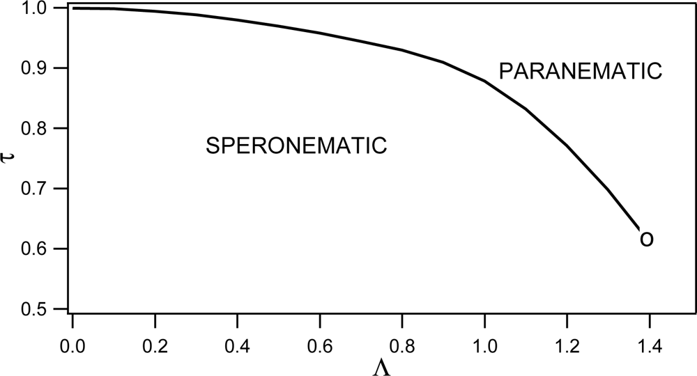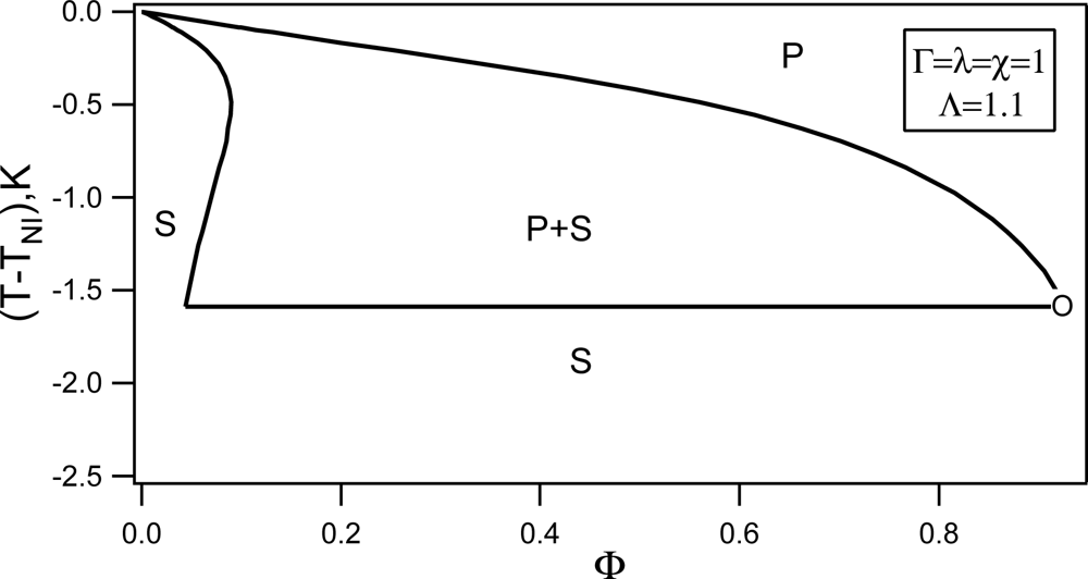 Onsager obtained an approximate variational solution which is based on a trial function of the form f = (const) cosh(α cos θ), where α is a variational parameter and θ is the angle between the molecular axis and the nematic axis. It was found [51] that the system exhibits an abrupt first-order phase transition from the isotropic to the nematic phase characterized by the following values of volume fractions of the isotropic φiso, nematic phase φnem, and order parameter S at coexistence