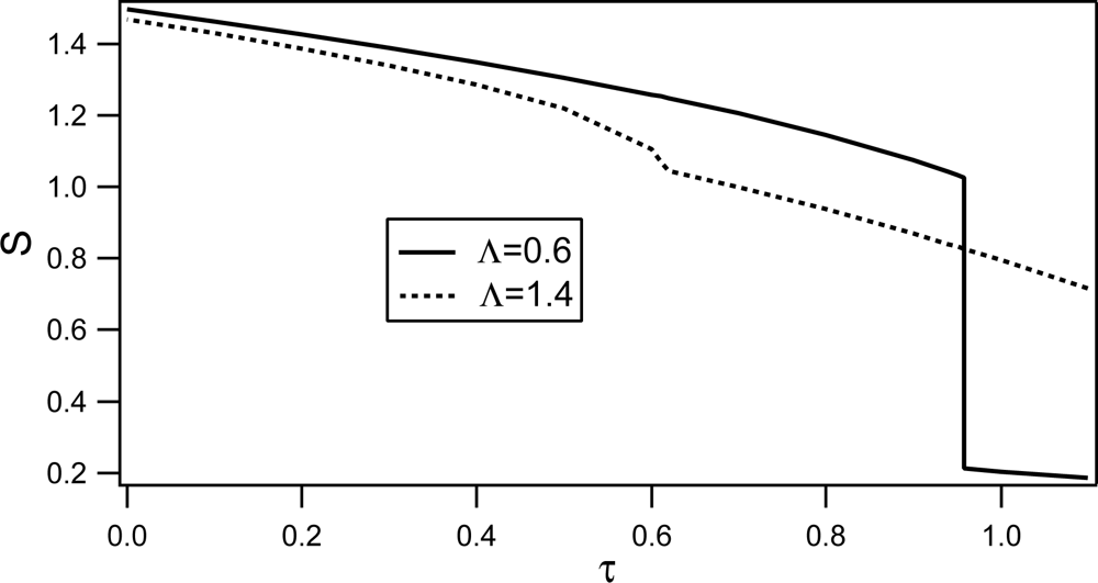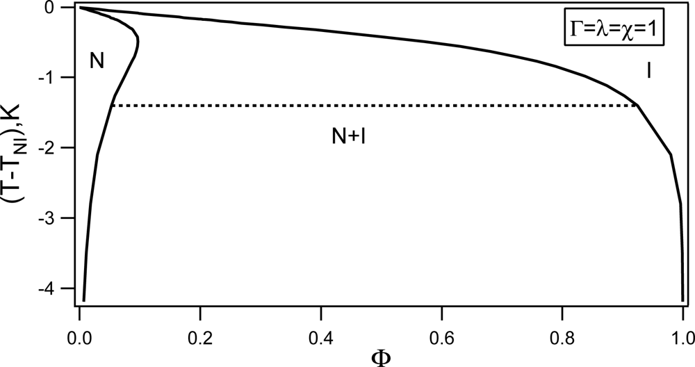 where S(m) is calculated from Equation (13). The results lead to a first order nematic-isotropic (NI) phase transition at