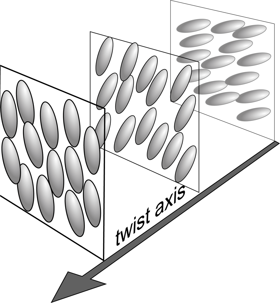 is not constant in space. The preferred conformation is helical (see Figure 2). The helical distortion can be found either in pure cholesterol esters (which are chiral) or by dissolving in a nematic a fluid composed by chiral molecules.