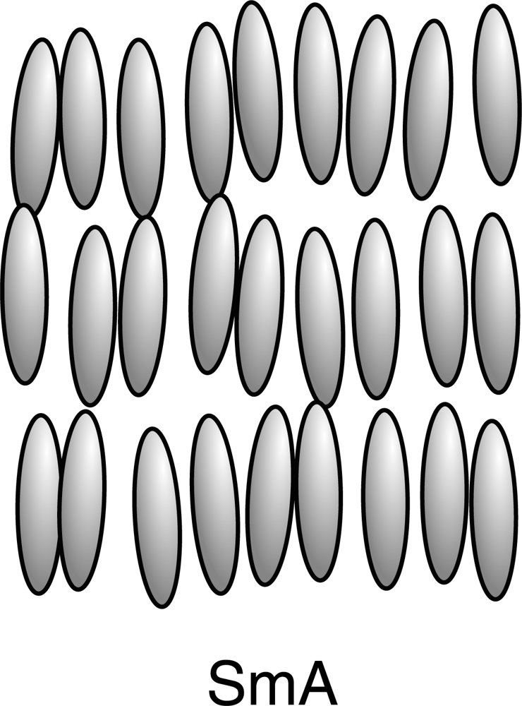 When the crystalline order is lost in two dimensions, one obtains the two-dimensional liquids, called smectics. Smectics liquid crystals have layered structures with a well-defined interlayer spacing that can be measured by X-ray diffraction. In addition to the orientational order, the smectic molecules exhibit some correlations in their position. In most smectics the molecules are mobile in two directions and can rotate around one axis. The interlayer attractions are weak compared with the lateral forces between molecules and the layers are able to slide over one another relatively easily which gives rise to fluid property of the system with higher viscosity than nematics. When smectic and nematic phases are found in one compound, the nematic phase is almost always found at higher temperatures with the exception of reentrant nematic phase.