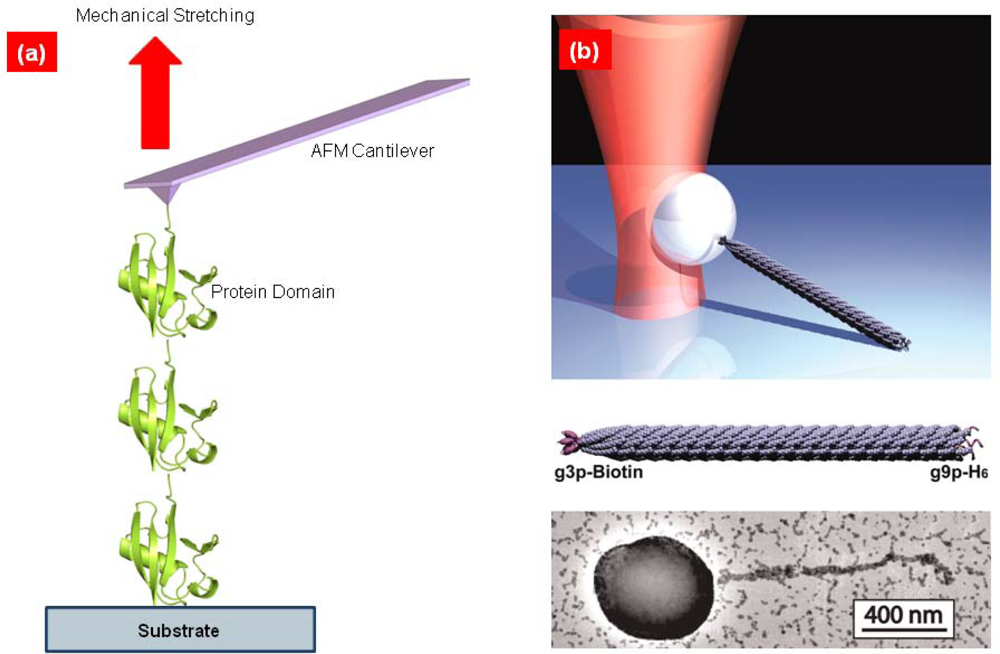 (a) Schematic illustration of atomic-force-microscopy (AFM)-based single-molecule pulling experiments of biological molecule: One end of biomolecule is attached to the substrate, while the other end attached to AFM cantilever tip is stretched by manipulation of AFM. (b) (Top) Schematic of laser tweezer (LT)-based single-molecule stretching of biomolecule: One end of biomolecule is attached to the substrate whereas the other end attached to nanoparticle that can be trapped by LT is stretched by control of LT. (Middle) Schematic illustration of biomolecular structure (Bottom) Microscope image of biomolecule attached to nanoparticle that could be trapped by LT. Figures are adopted from Ref. [29].