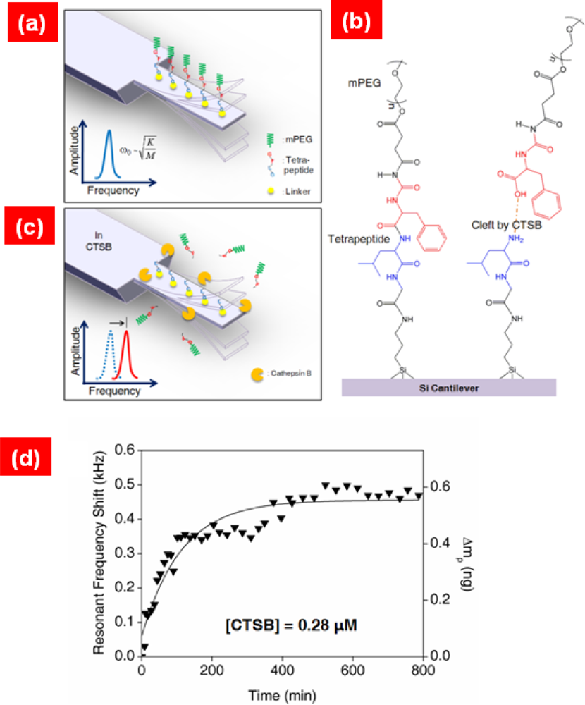 Schematic illustration of in situ monitoring of proteolysis of peptide by protease based on resonant microcantilever immersed in buffer solution: (a) A cantilever functionalized by peptide chains is vibrating with the resonance of ω0. (b) Chemical structure of peptide chain and/or cleft peptide chain by protease. (c) Enzymatic cleavage of peptide due to protease increases the resonance of microcantilever due to decrease of molecular mass driven by proteolysis. (d) Resonant frequency shift due to enzymatic cleavage of peptide is well described by Langmuir kinetics. Figures are adopted from Ref. [110].