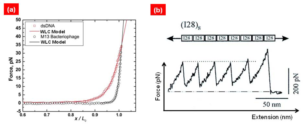 (a) Typical force-extension of biomolecule such as double-stranded DNA or bacteriophage obtained from LT bioassay. The force-extension curves of dsDNA and/or bacteriophage are well fitted to worm-like-chain (WLC) model. Figures are adopted from Ref. [29]. (b) Force-extension curve of muscle protein titin immunoglobulin (Ig) 28 domains obtained from AFM bioassay. The force peak in force-extension curve corresponds to the unfolding of a single Ig 28 domain. Figures are adopted from Ref. [41].