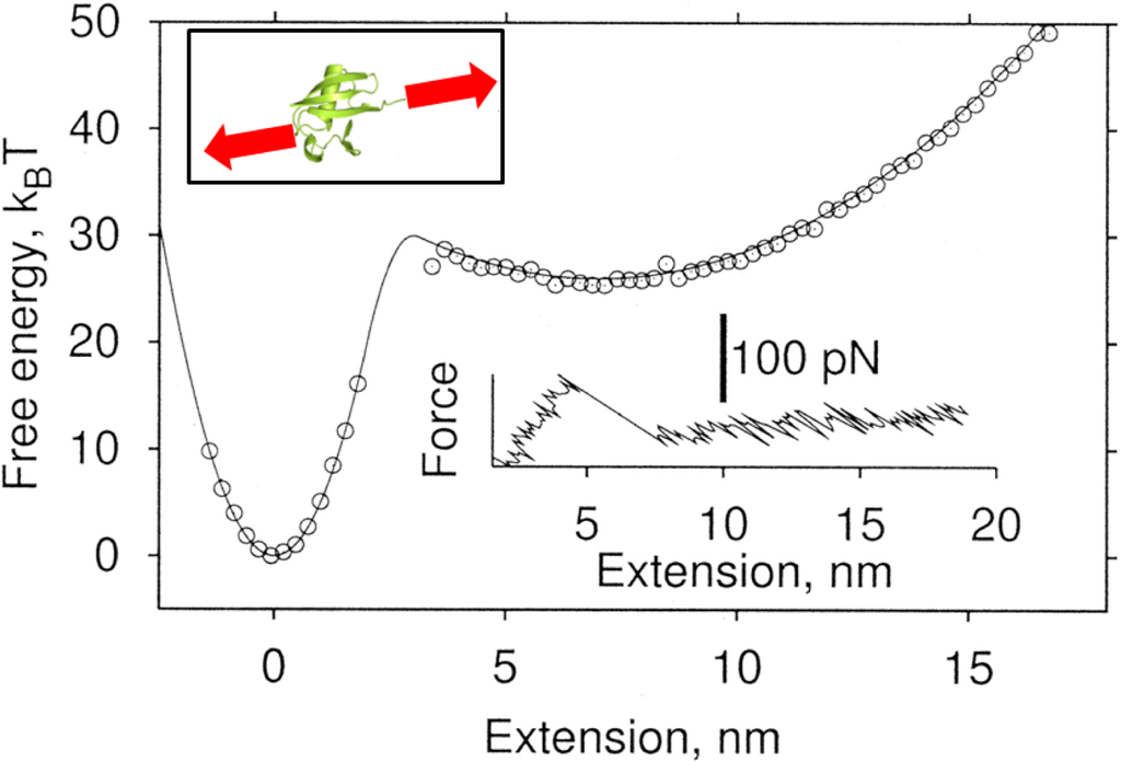 Free energy landscape, for protein, reconstructed from single-molecule pulling simulation with Jarzynski’s theorem: Inset above shows the schematics of stretching of a single protein domain by mechanical force. Inset below provides the force-extension curve obtained from simulation. Figures are adopted from Ref. [52].