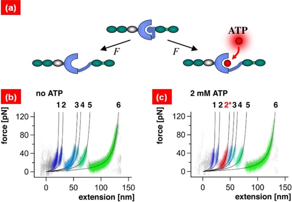 (a) Schematic illustration of stretching of titin kinase: Stretching of titin kinase enables the opening of binding site onto which ATP molecule can be bound. (b) Force-extension curve of titin kinase obtained from AFM bioassay. (c) Force-extension curve of titin kinase in the presence of ATP molecule. The asterisk indicates the unique feature in force-extension curve due to ATP binding. This implies the enzymatic activity of titin kinase by mechanical force. Figures are adopted from Ref. [56].
