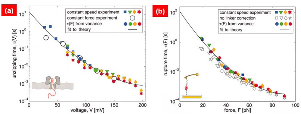 (a) Kinetic rate for RNA hairpin unzipping by nanopore-based bioassay is compared with Dudko-Hummer-Szabo (DHS) model. (b) Comparison of kinetic rate for mechanical unfolding of protein with DHS model. It is shown that kinetic rate for mechanical unfolding and/or unzipping of folded domain can be well described by DHS model. Figures are adopted from Ref. [67].